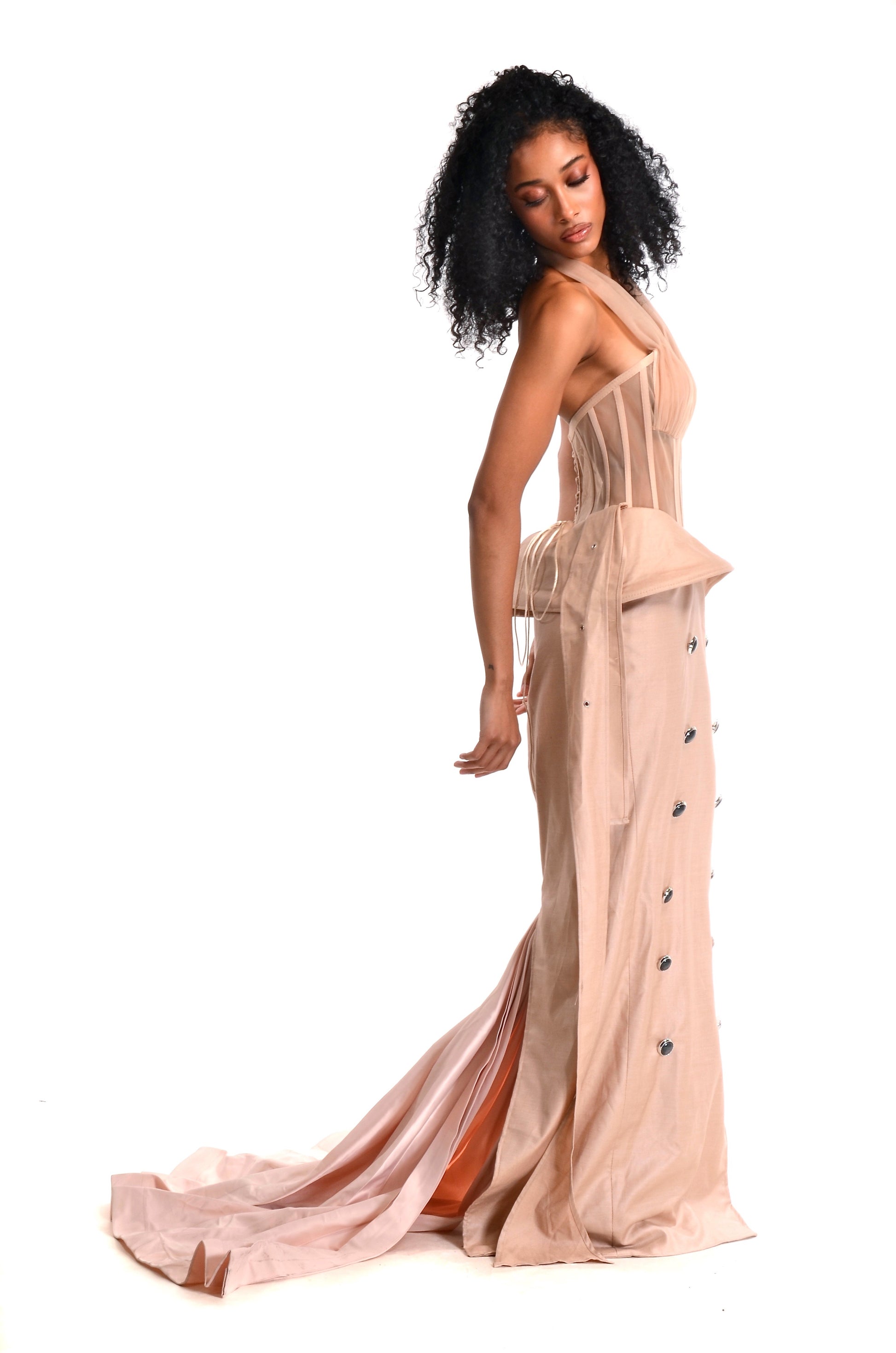 The Sandstone gown features a sculpted corset bodice with sheer paneling that delicately contours the form. Crafted from a soft nude silk blend, the design cascades into a tailored column skirt adorned with hand-set jet buttons for a touch of architectural detail. The artfully draped waistline and floor-grazing ties create effortless movement and allure, making this gown a statement of refined sensuality and contemporary elegance.