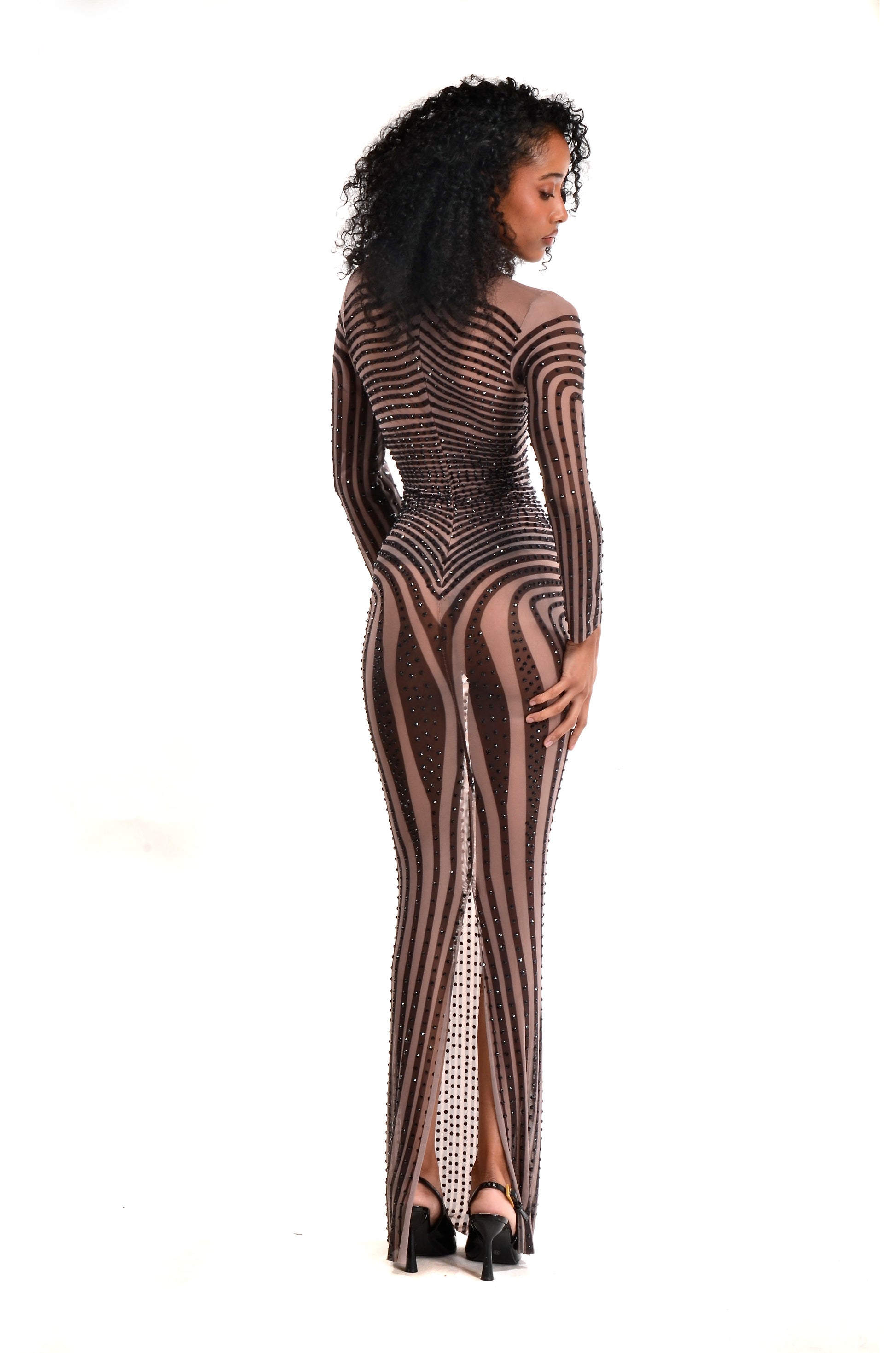 This gown is a striking statement piece that merges architectural design with sensual elegance. Crafted from a sheer nude base, it features meticulously placed black linear beadwork that creates a hypnotic, body-contouring illusion. The long sleeves and high neckline balance the gown’s daring transparency, while the floor-length silhouette elongates the figure with modern sophistication.